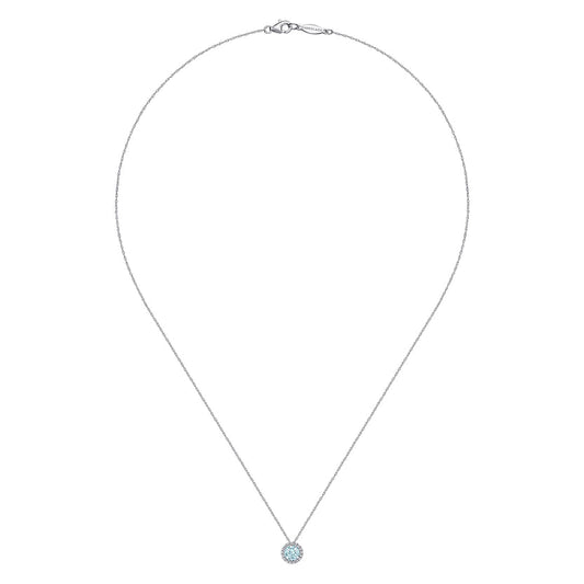 14K White Gold Aquamarine and Diamond Halo Pendant Necklace