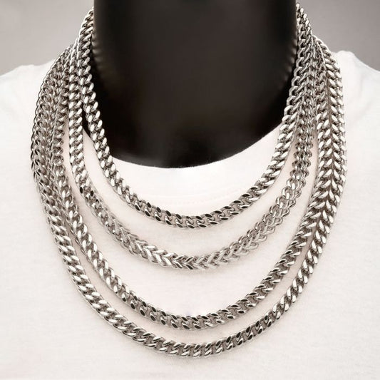 Chains and neckwear are timeless must-haves for a person to own and wear. INOX offers a full range of lengths to choose from starting at 20” up to 26” giving a person the option of mixing and matching chains to layer. INOX Men’s Jewelry has many in-demand chain types to choose from in both 18K Gold Plated and High Polished Steel with various thicknesses. For that special someone looking to try chains for the first time, or grow a collection, INOX presents an assortment of chains at an excellent price point to wear or gift. Miami Cuba, Paper Clip, Double Diamond Cut, Foxtail, Rattail, Boston Link, Classic Curb, Knife Edge, Wheat Chain, Lab-Grown Diamond inlay, Cubic Zirconia accented, and Figaro are just some of the many options available in the INOX chain collections.