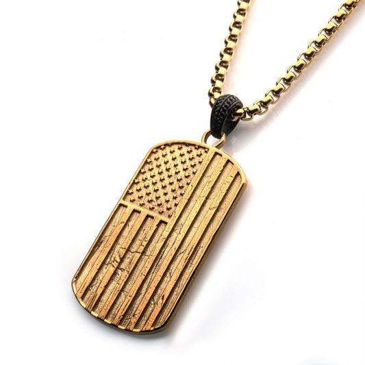 Polished Gold Plated Rugged American Flag Pendant on a Polished Black Plated Bail with Gold Plated Box Chain | INOX