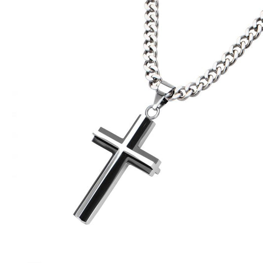 Stainless Steel Black Plated & Steel 3D Cross Pendant with chain | INOX