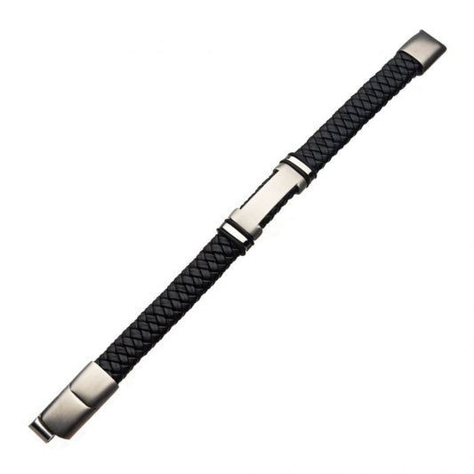 Men's Black Leather with Steel ID Bracelet | 8.25" - 8.75" Adjustable