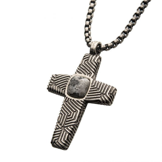 Stainless Steel Silver Plated Cross Pendant with Gray Jasper Stone, with Steel Box Chain | INOX