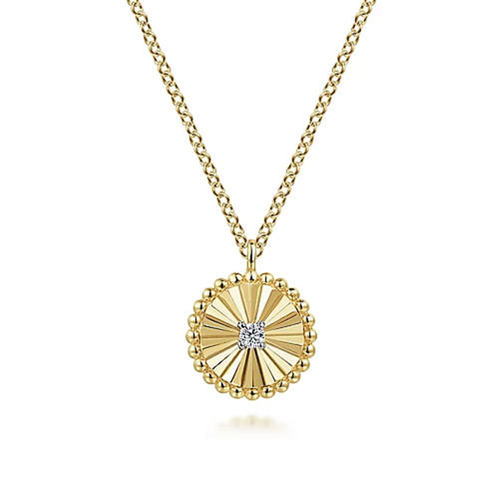 Experience the captivating beauty of Gabriel and Co's Bujukan Collection with our stunning 14K White-Yellow Gold Bujukan Diamond Cut Pendant Necklace. Fall in love at first sight with this guaranteed piece that features a chain length of 17.5 inches and 0.02 ct diamonds.