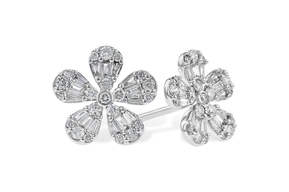 Each petal is carefully crafted with 0.19 carats of baguette diamonds and 0.31 carats of round diamonds, creating a harmonious mix of shapes and textures that add depth and dimension to the design. The polished 14K white gold setting accentuates the diamonds' radiance, making these earrings a sophisticated statement piece that captures the beauty of blooming flowers.