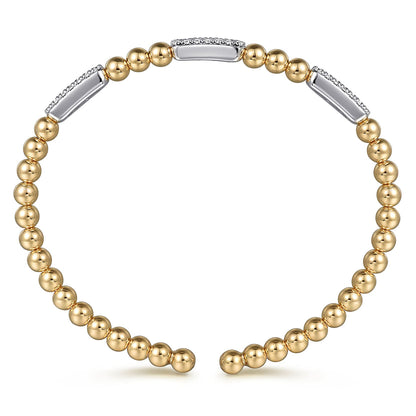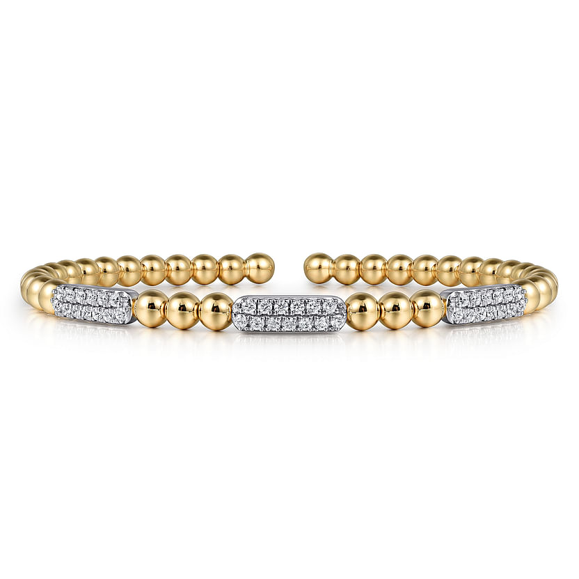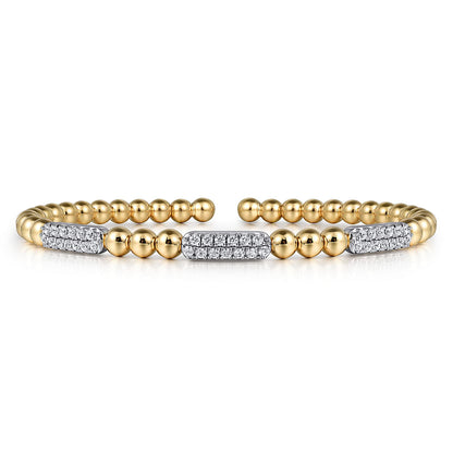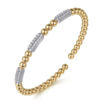 14K Gold Diamond Pave Three Station Bar Bujukan Beads Split Bangle Bracelet