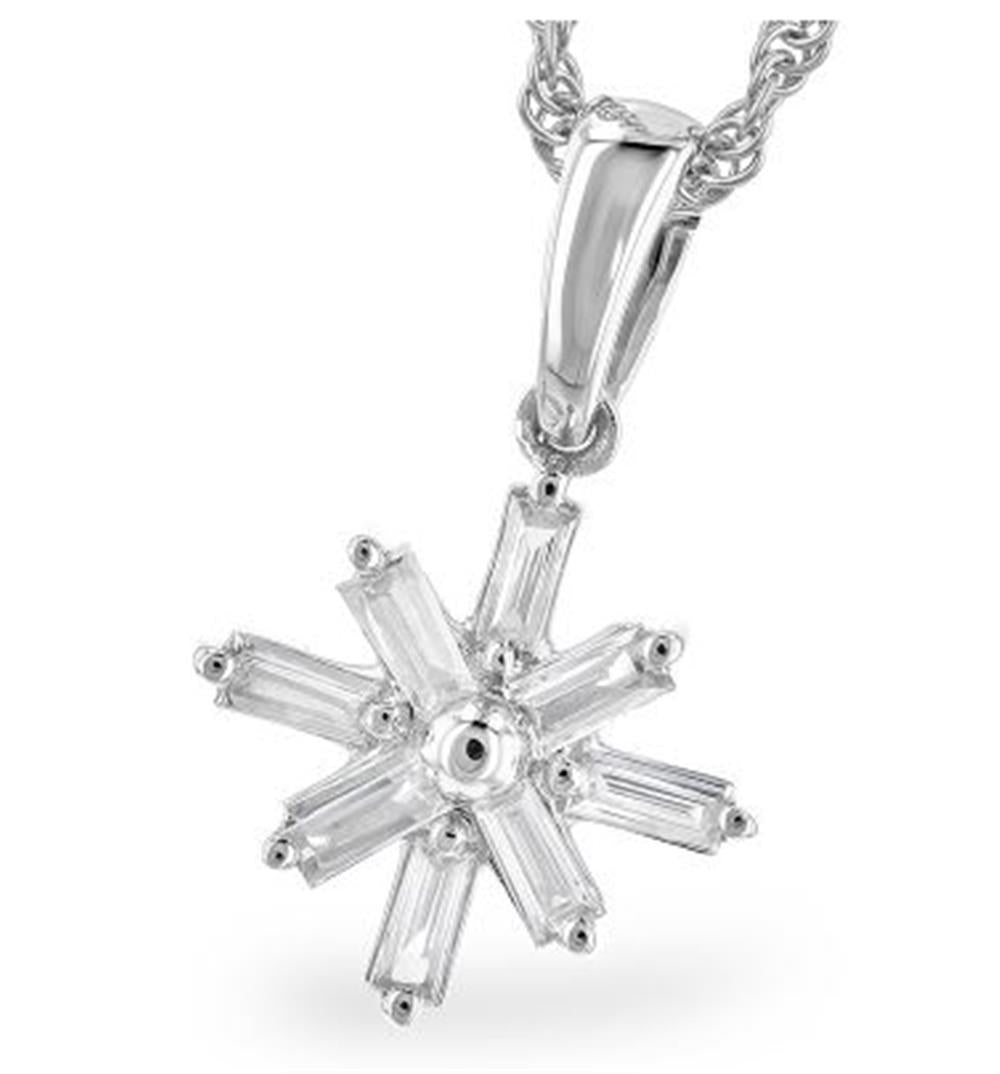 Enhance your look with this exquisite necklace made of 14K white gold. Its captivating snowflake design, adorned with .14 carat baguette diamonds, exudes a sense of elegance and sophistication that will elevate any outfit. Don't miss out on this one-of-a-kind piece!