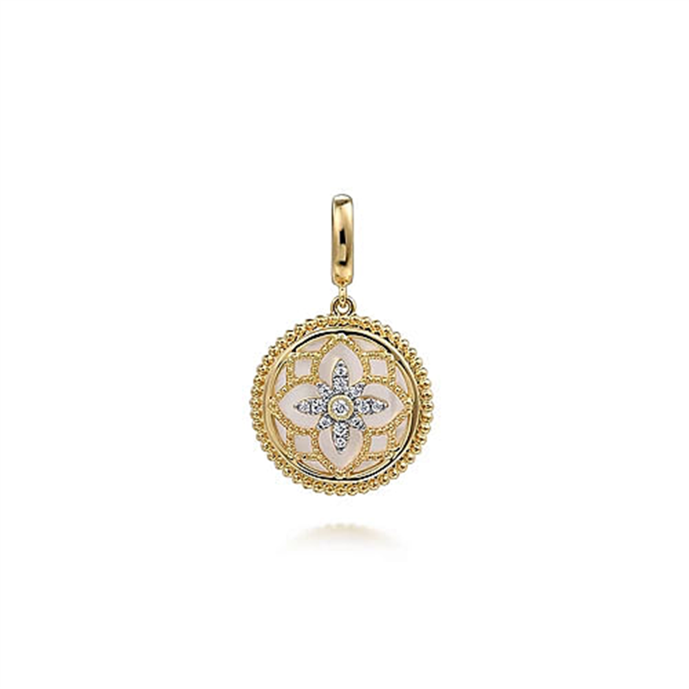 Get swept away by the beauty of our 14K Yellow Gold Bujukan Diamond and Mother of Pearl Medallion Pendant. From the renowned Bujukan Collection by Gabriel and Co, this piece will capture your heart with its enchanting design. A delicate floral motif adorns the romantic medallion, artfully crafted with openwork 14K yellow gold and sparkling 0.08ct diamonds. The stunning mother of pearl background adds a touch of elegance to the 18mm round pendant, accentuated by tiny golden spheres. Don't miss out on this exquisite piece featuring a 0.08ct natural diamond and a 18mm pearl.