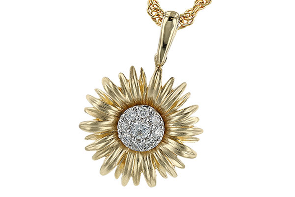 Radiant and full of warmth, this sunflower necklace in 14K yellow gold captures the joy and beauty of nature’s most cheerful bloom. The meticulously detailed petals exude a soft, golden glow, while the center of the sunflower sparkles with .10 carats of diamonds, adding a touch of elegance and luxury.