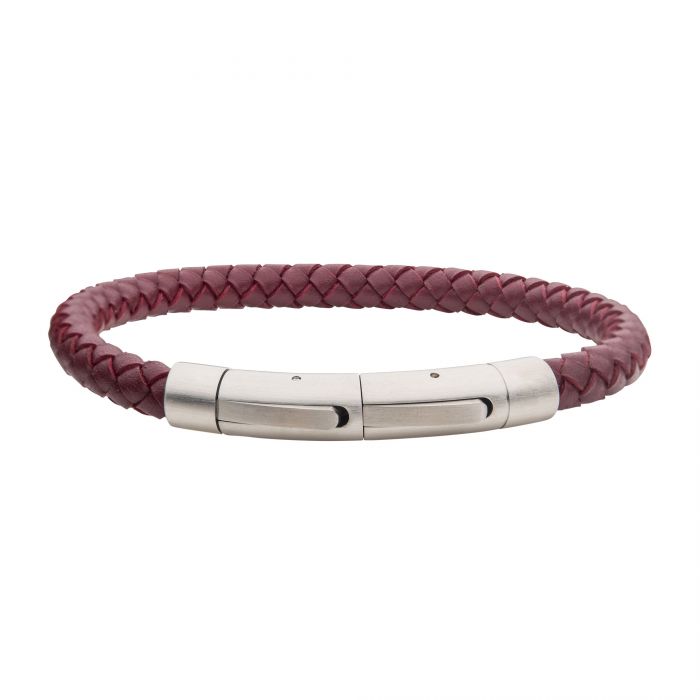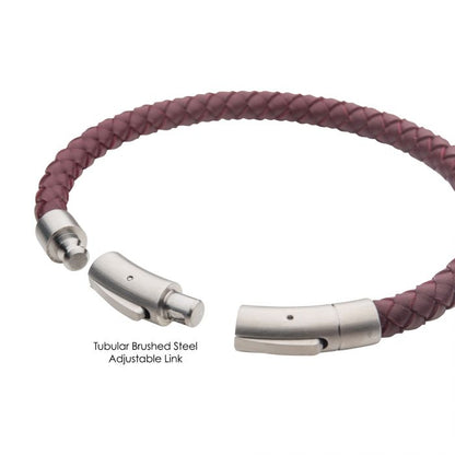 Men's Stainless Steel 6mm Burgundy Genuine Leather with Brushed Tubular Press Clasp Bracelet. Comes with 1 Self-Adjustable Link.