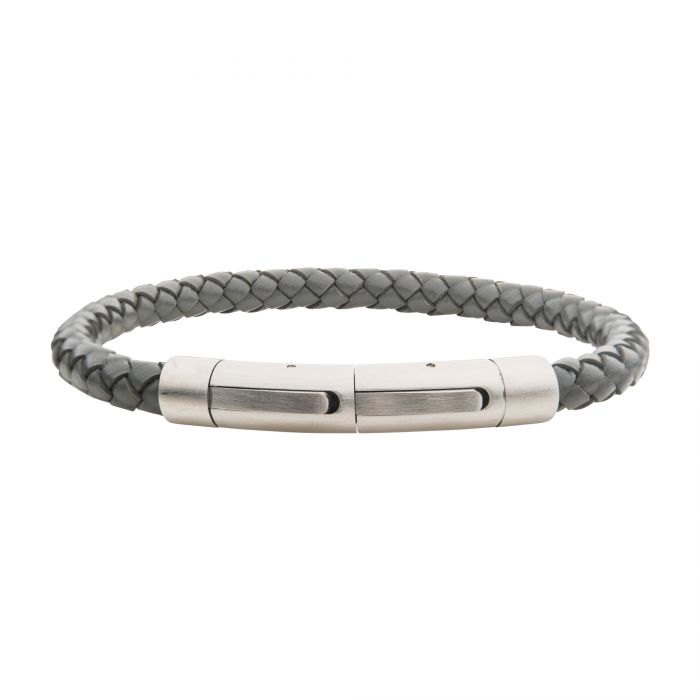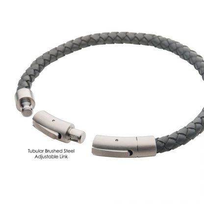 Men's Stainless Steel 6mm Grey Genuine Leather with Brushed Tubular Press Clasp Bracelet. Comes with 1 Self-Adjustable Link.