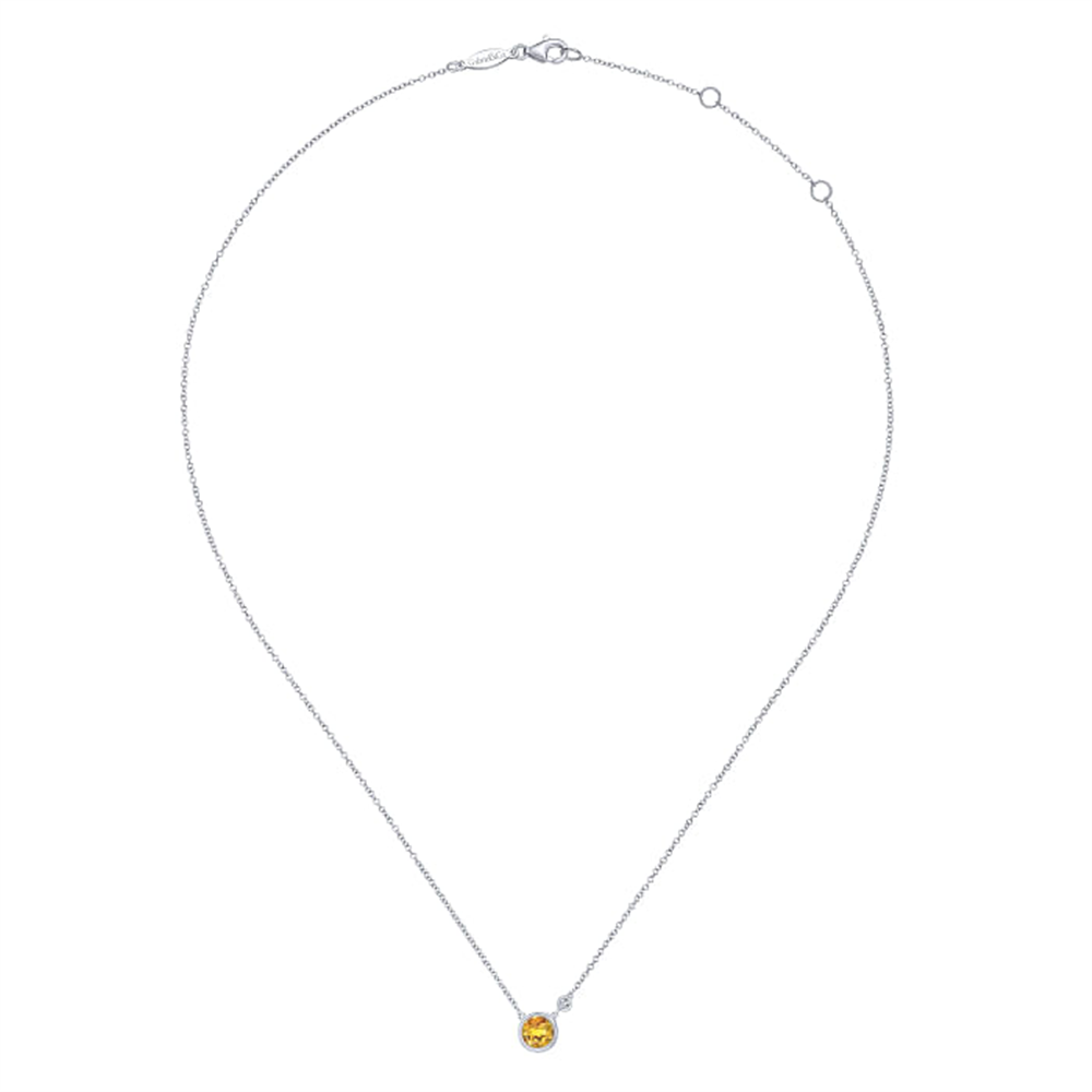 Presented in the stunning Lusso Color Collection, this 925 Sterling Silver Citrine and Diamond Pendant Necklace (Serial No: S1732135) showcases a captivating 0.83 carat Faint Color Citrine and a sparkling 0.02 carat SI2 or higher Diamond. Enhance your wardrobe with this exquisite piece from Gaby Silver, measuring 17.5 inches in size.