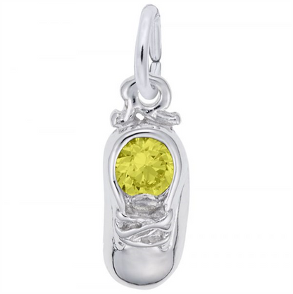 Celebrate the birth of a November baby with the Sterling Silver November Baby Shoe Charm from Rembrandt Charms, available exclusively at Avonlea Jewelers. This charming piece features a delicate baby shoe adorned with a beautiful topaz-colored stone, symbolizing the birthstone for November, making it a perfect keepsake for new parents and grandparents.