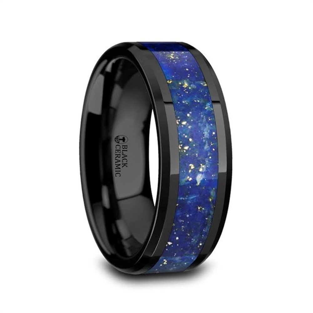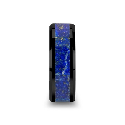 MARLOW Men’s Polished Black Ceramic Wedding Band with Blue Lapis Inlay, 8mm, size 10.5