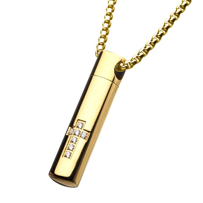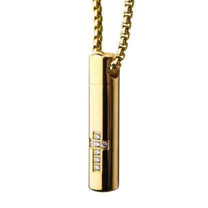 Men's Stainless Steel Gold Plated Stash with Cross Clear CZ Pendant with 22 inch long Box Chain