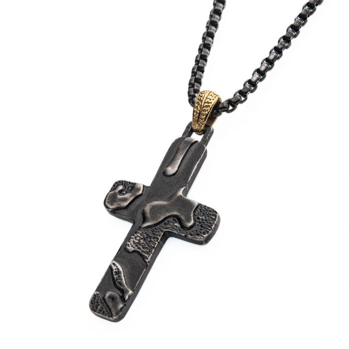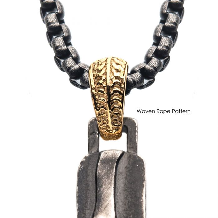 Men's Stainless Steel Gun Metal Plated 3D Canyon Pattern Pendant on a Polished 18K Gold Plated Bail with 24 inch long Gun Metal Plated Box Chain.