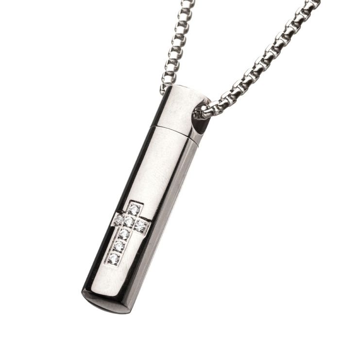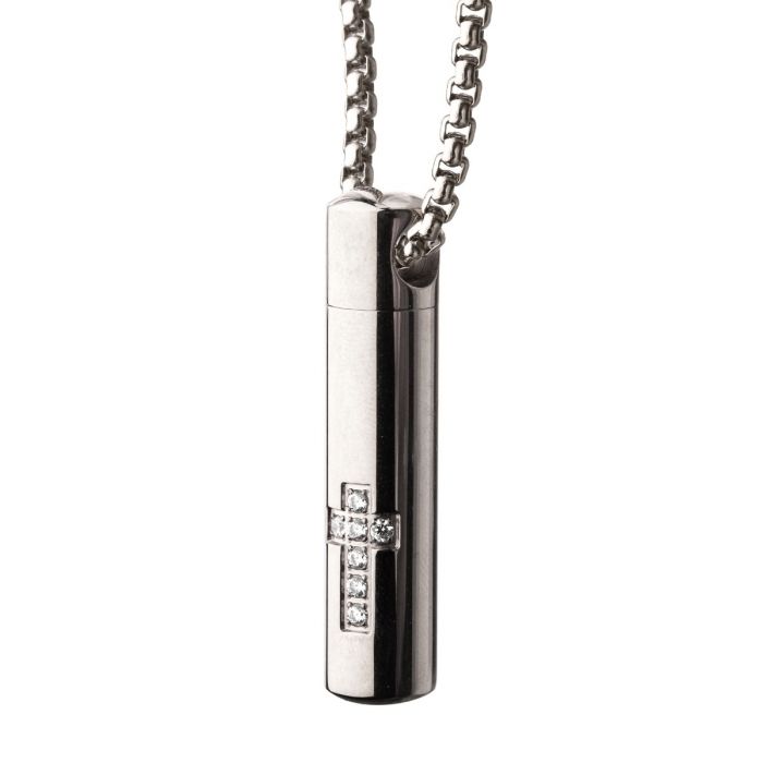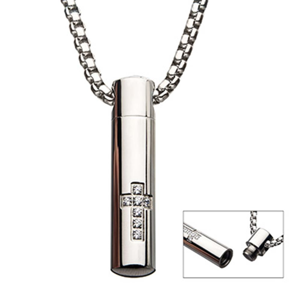 Stainless Steel Memorial Cross Pendant with Clear CZ & Steel Box Chain | INOX