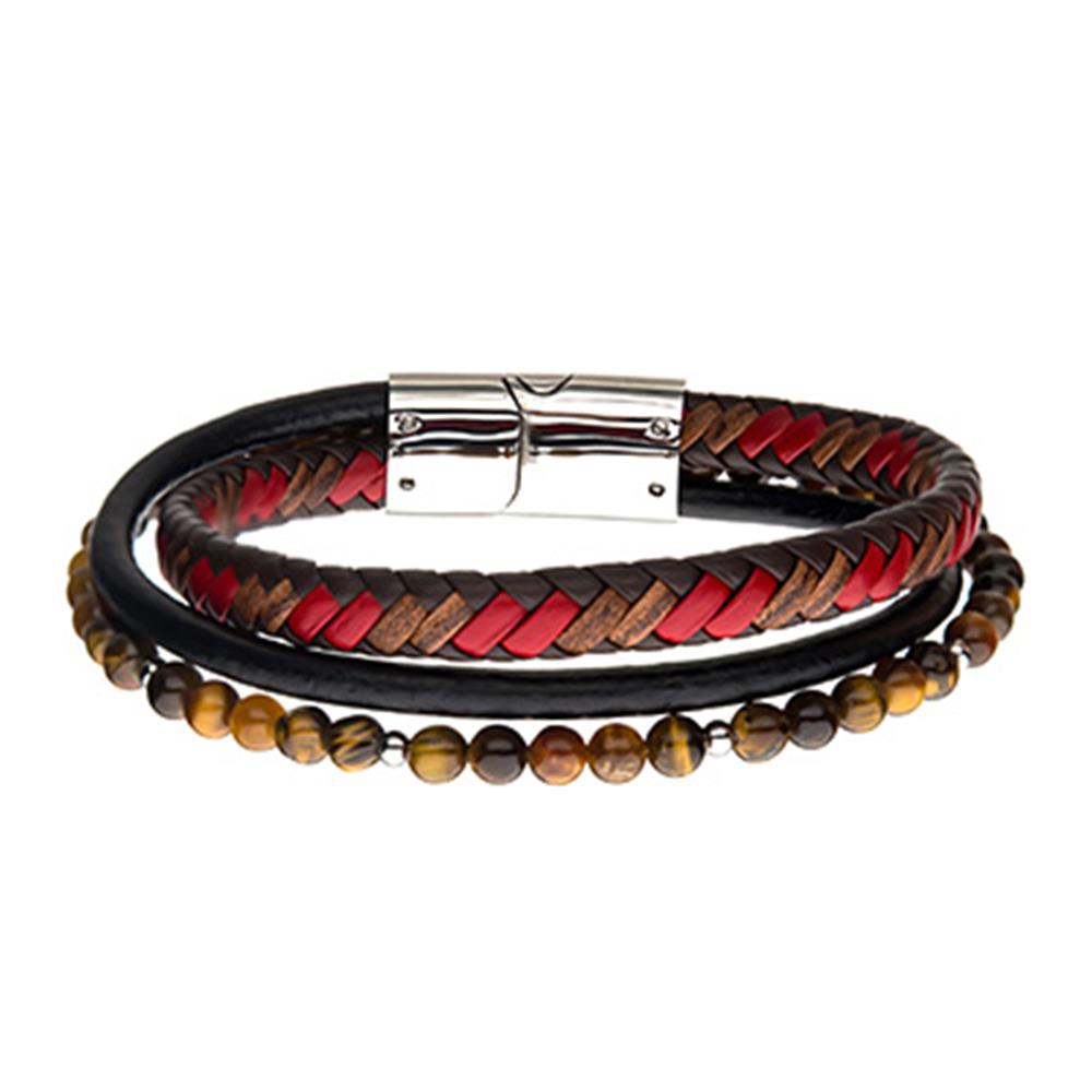 Men's Stainless Steel Tiger Eye Beads with Brown and Red Leather Layered Bracelet. 8 1/4 inch long includes Steel Extra Self Adjustable Link Brushed Clasp.
