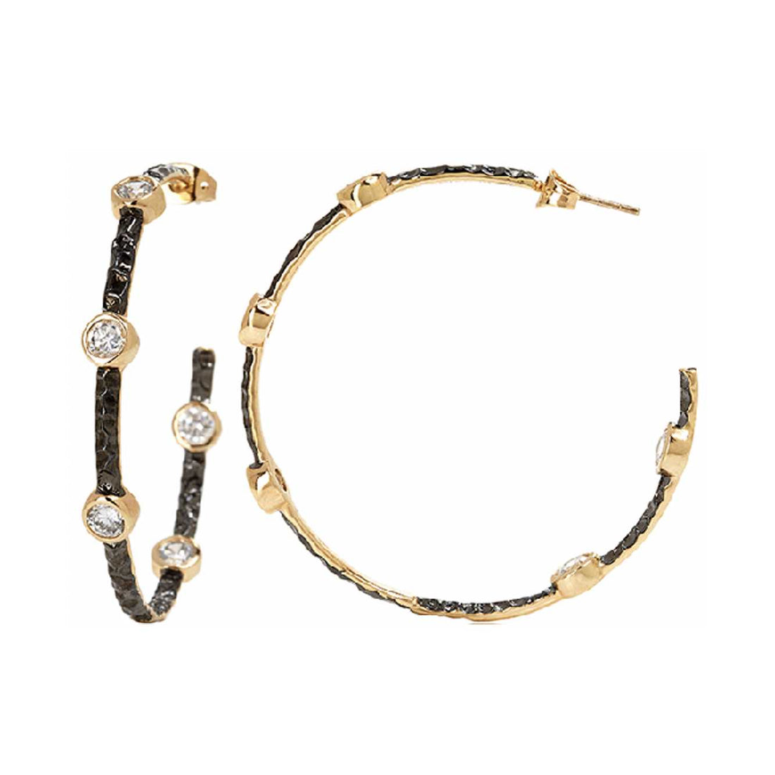 The Starry Night Hoop Earrings are a true statement piece, blending industrial edge with refined elegance. Featuring hammered dark rhodium for rich texture, these hoops are adorned with hand-set lab-created diamond simulants, sparkling from every angle. Framed with signature matte gold, the design showcases intricate details both inside and out, ensuring an eye-catching moment with every turn.